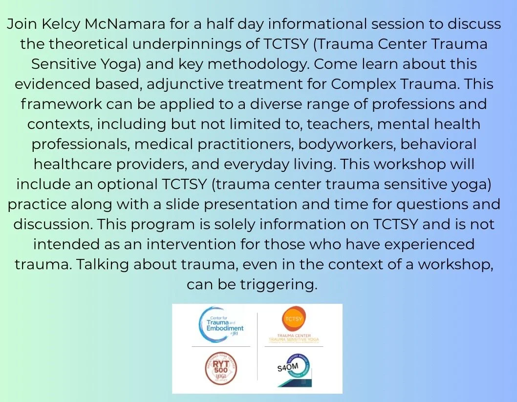 Join Kelcy McNamara for a half day informational session to discuss the theoretical underpinnings of TCTSY (Trauma Center Trauma Sensitive Yoga) and key